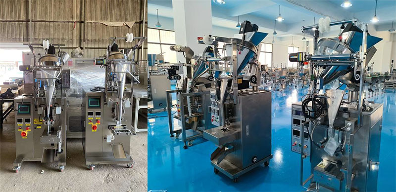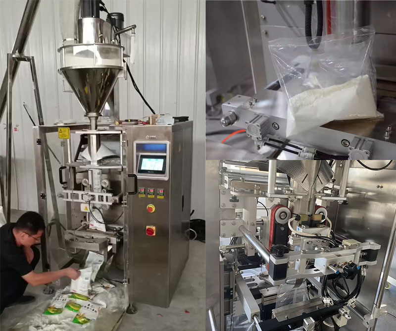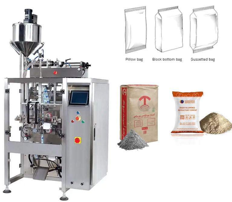When the Cement powder packaging machine VFFS is in operation, the packaging film is first supplied through the film unwinding mechanism, then folded into a preset bag shape by the forming device and heat-sealed on the sides to form a sealed bag tube. Next, cement powder falls from the hopper into the screw feeding mechanism, where a weighing sensor accurately measures the preset weight, and the powder is injected into the bag tube at a uniform speed through the filling nozzle. Subsequently, the sealing mechanism heat-seals or sutures the bag opening to prevent powder leakage and moisture during transportation, while also marking the date. Finally, the cutting mechanism separates the powder into individual packaging bags, which are then conveyed out by the conveyor device. The entire process of forming, filling, sealing, and cutting is automated.