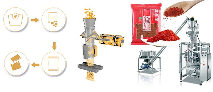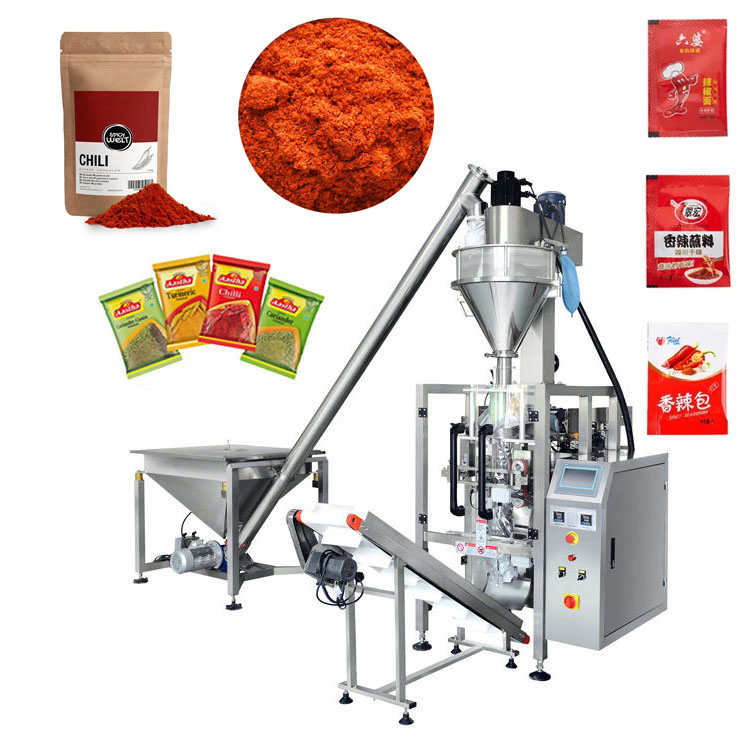 The chili powder vertical packaging machine first loads the packaged chili powder into a storage bin. The chili powder is weighed by a metering device, while the packaging film is stretched and folded into the pre-set bag shape. The measured chili powder enters the bag through the sealed discharge port. A heat sealer seals the bag and cuts it, and the finished chili powder is then transported to the designated location via a conveyor.
