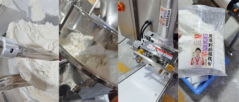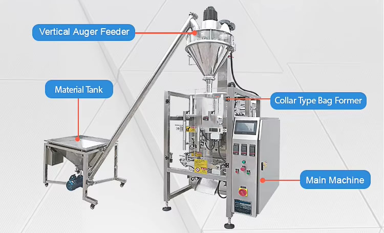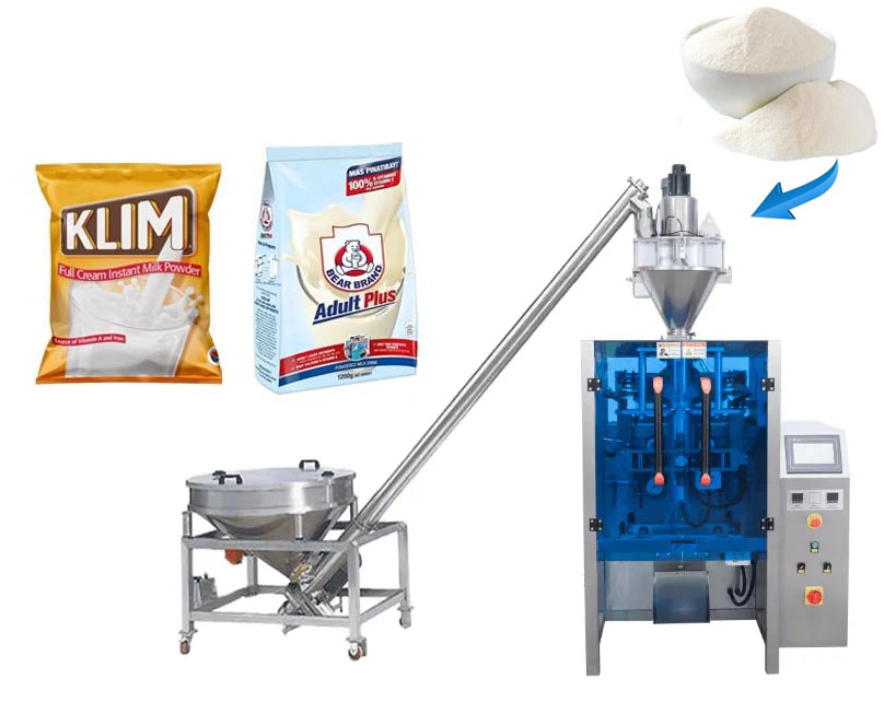 When a VFFS machine for milk powder packaging is working, the packaging film is first stretched into the required bag shape. Milk powder falls from the hopper into the screw conveyor channel and is fed into the bag by the screw. The screw conveyor prevents clumping and precisely controls the packaging quantity of each bag. The filled milk powder bags are then heat-sealed. The connected milk powder bags are then cut, and the finished bags fall below to the finished product area.