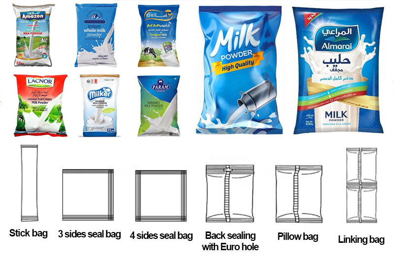 The VFFS machine for milk powder packaging can package different types of bulk milk powder into finished bags. It can be used in the food, baby product, and dairy processing industries to package infant formula, toddler formula, adult whole/skim milk powder, high-calcium low-fat milk powder for middle-aged and elderly people, milk powder for pregnant women, goat milk powder, organic milk powder, probiotic milk powder, and other milk powders with varying flowability and particle sizes. It can quickly complete the entire process from roll forming, precise filling, sealing, to batch number printing. It supports various packaging sizes, including small bags (5-50g), medium bags (100-500g), and large bags (1000g-5000g), meeting the needs of retail, family packs, and baby stores.