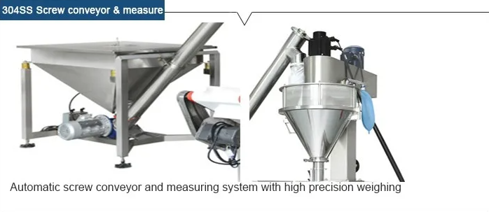 An auger filling system uses a rotating screw mechanism to accurately measure and dispense a specific weight of dry chili into the packaging pouch. It is suitable for precise dosing and handling of powdered chili.