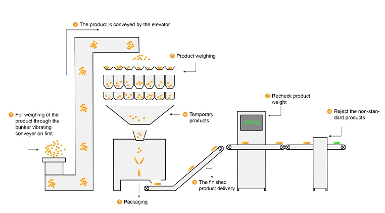 Combined multi-head weighing machine is specially used for solid filling, such as candy, nuts, pasta, dried fruits and vegetables, etc.